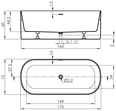 Bañera acrílica exenta con desagüe click-clack y rebosadero integrado blanco brillo y blanco mate.