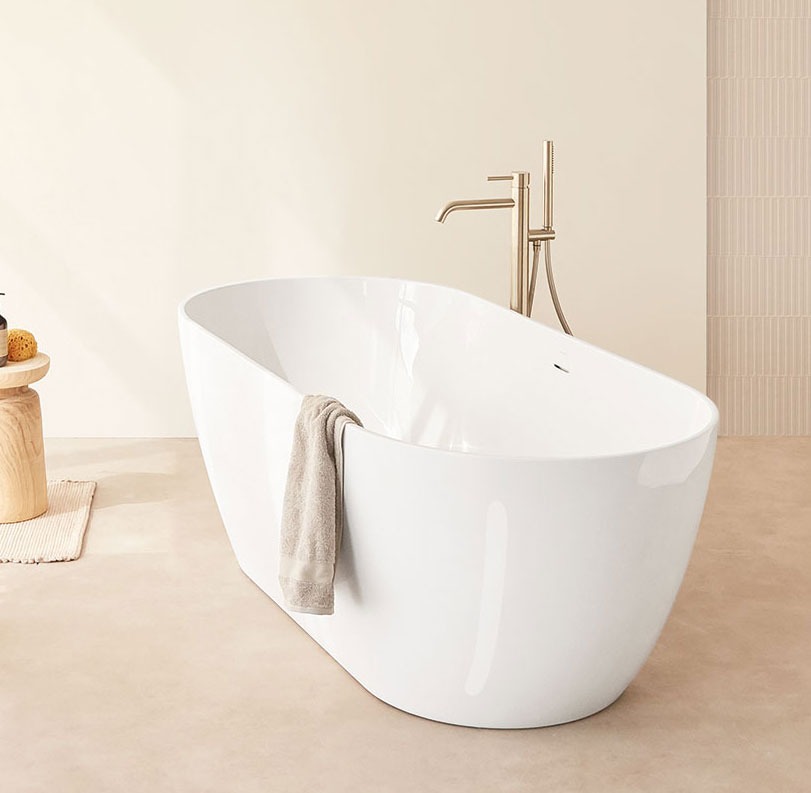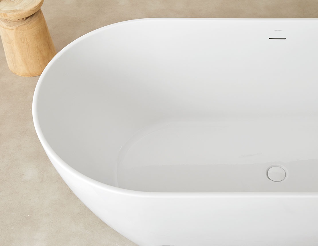 Bañera acrílica exenta con desagüe click-clack y rebosadero integrado blanco brillo.