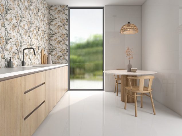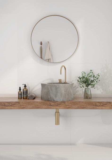 Su superficie blanca se presenta en dos acabados: satinado y pulido, que permiten jugar con diferentes sensaciones y atmósferas. El acabado satinado aporta suavidad y equilibrio visual, mientras que el pulido refleja la luz con elegancia, amplificando los espacios y reforzando su carácter contemporaneo.